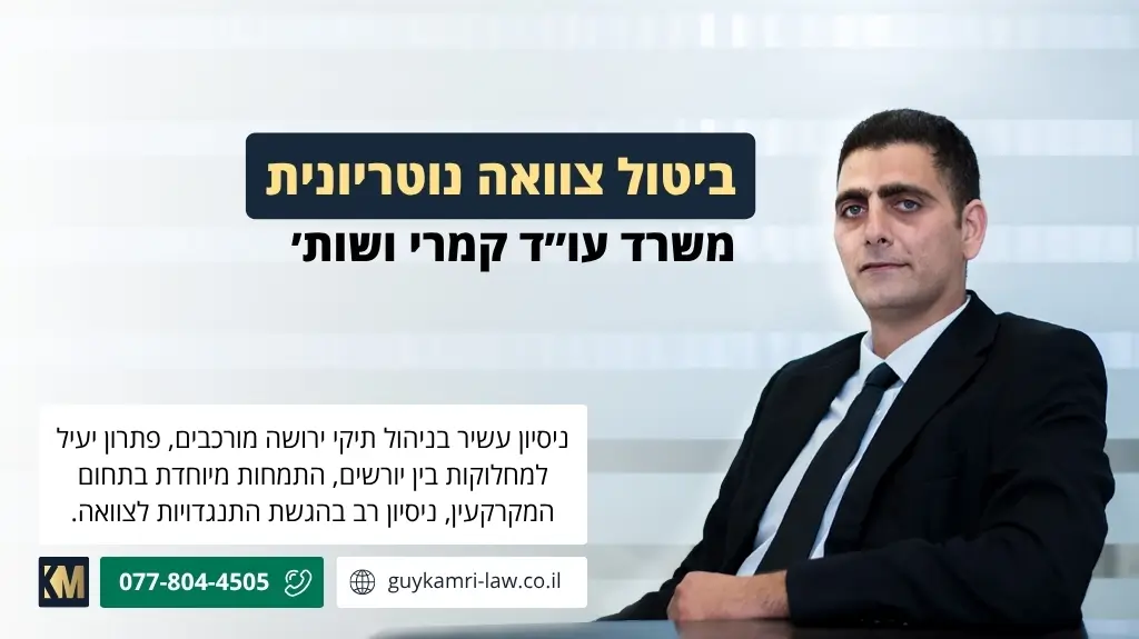 הליך ביטול צוואה נוטריונית, או הגשת התנגדות לה, מחייב ליווי משפטי מדויק. מומלץ להיעזר ב עורכי דין צוואות הבקיאים בדיני ירושה ובפרוצדורות מול הרשם לענייני ירושה ובית המשפט לענייני משפחה.