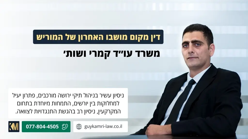 לסיכום, המקום שבו חי, הוא המקום שקובע המונח "דין מקום מושבו האחרון של המוריש" אולי נשמע טכני, אבל ההשלכות שלו על הירושה הן עצומות. זו השאלה הראשונה והבסיסית שמכריעה את כל שאר התהליך. כדי לוודא שזכויותיכם נשמרות ושהליך הירושה מתבצע על פי החוק – חשוב לפנות לייעוץ משפטי מקצועי.