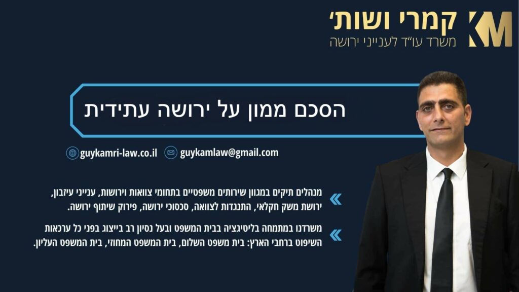 הסכם ממון על ירושה עתידית הוא כלי חשוב להגנה על זכויות כלכליות ולמניעת סכסוכים עתידיים. בעוד שהנושא עלול להיות רגיש, הדיון הפתוח והכן שנדרש לצורך עריכת ההסכם יכול לחזק את הקשר בין בני הזוג ולהבטיח עתיד כלכלי יציב יותר. אם אתם שוקלים לערוך הסכם ממון על ירושה עתידית, אל תהססו לפנות להתייעצות עם משרד עו"ד קמרי ושות' – עו"ד לענייני ירושה, לטובת ניסוח הסכם מקיף התפור למידותיכם בהתאם לצרכיכם הייחודיים.