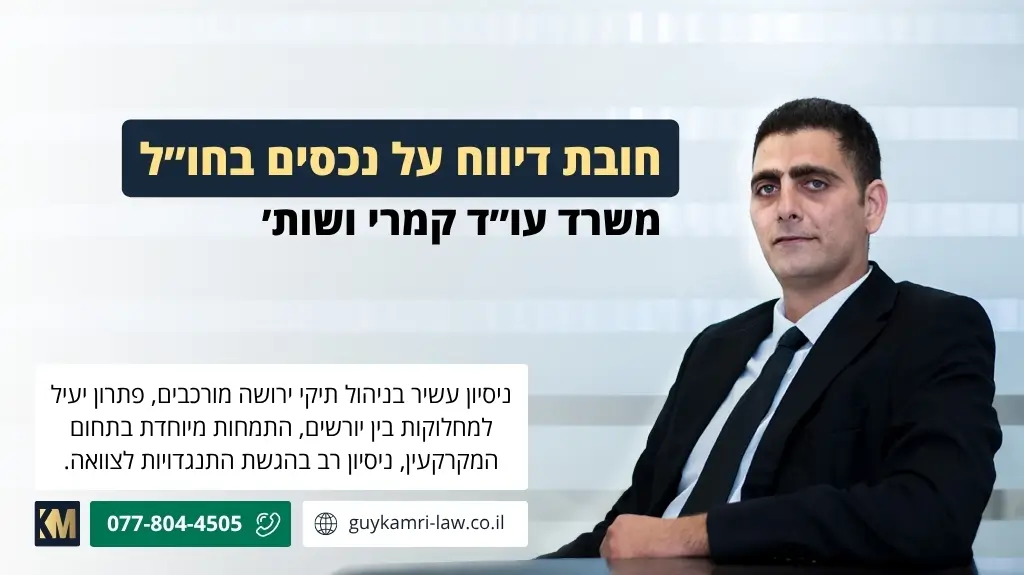 לסיכום, אם יש לכם נכסים, כספים או חשבונות בנק מחוץ לישראל – ובפרט אם קיבלתם אותם בירושה – חשוב לבדוק האם אתם חייבים בדיווח. משרד קמרי ושות׳ עוסק בליווי יורשים בהתנהלות מול רשויות המס בישראל, תוך הגנה על הזכויות שלכם.